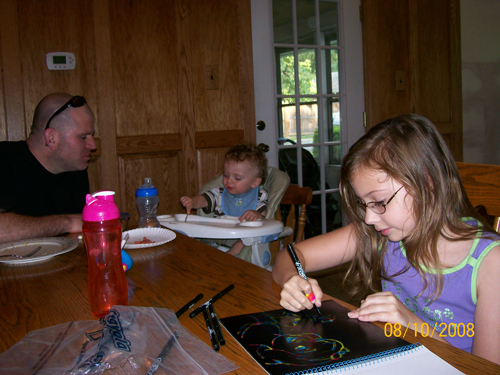 Savannah has her drawings...Dylan is painting with vegetables & Eric is providing running commentary.