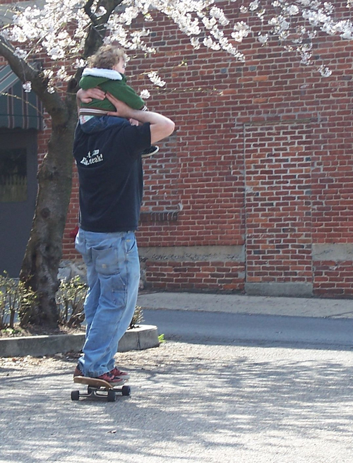 An example of the kind of shots that should be hidden from Grandparents. Dylan on his Dad's shoulders.....on a skateboard.