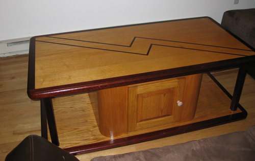 Here's a custom built coffee table using Red Oak in it's natural color and accented with Paduak edge banding and spindles. |
