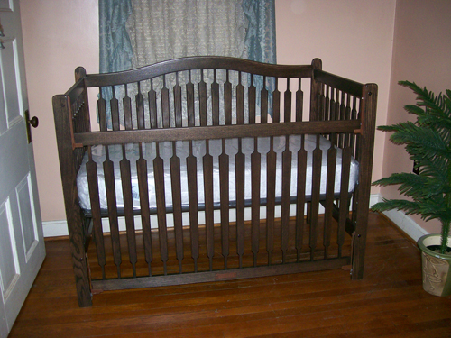 When you are ready to transition from the crib to the first bed, the front gate can be removed. When the child outgrows that arrangement, the rear panel is seperated from the assembly and becomes a headboard for a full size bed. Just bolt it to a metal frame or come back and see me for wooden rails and a footboard to match. Yes, other stains are available as well as your choice of wood species. |