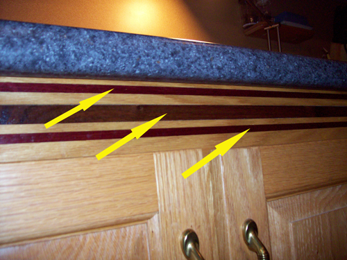 This simple decorative inlay provides a distinctive color accent throughout the kitchen cabinets in this home. The cabinets shown are clear Red Oak and the inlay consists of 2 narrow bands of Purple Heart separated by a wider band of Black Walnut. After the inlay was installed, the cabinets received 3 coats of catalyzed lacquer. |