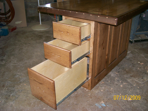 This table is designed to attach to the wall on the far end. Somthing similar to a peninsula cabinet. The near end is equipped with 3 drawers on full extension roller bearing glides. The drawers are constructed of 1/2" thick Baltic Birch throughout, including the bottoms. They have an applied drawer face of Red Oak. |