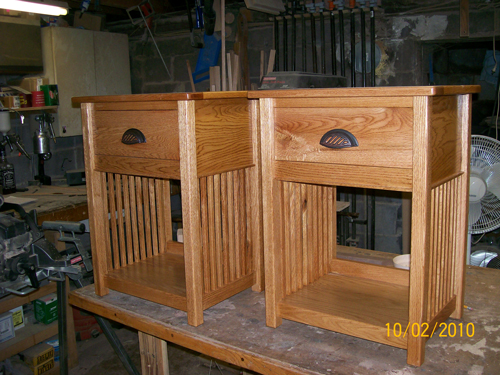 Another variation on the night stand theme. These were crafted to complement some existing bedroom furniture. They have a bit of the Craftsman style in them. The wood is Red Oak, no surprise there I guess. |