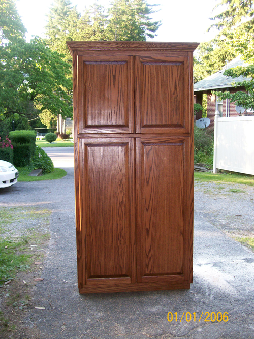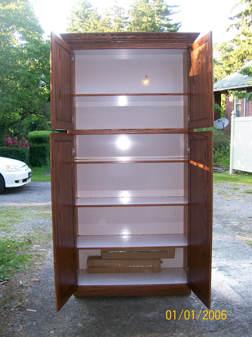 stand alone pantry cabinet topped with crown molding. The interior is a gloss white to really brighten it up and there is no center stile to block your access.