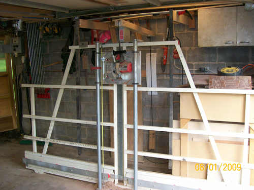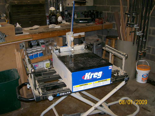 | Back to Top | This is our semi-automatic pocket hole machine for use in fabricating face frames for cabinets and a few other joints. It is on a mobile stand with adjustable supports to the left & right and it just drops it's mess onto the floor. |