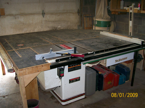 | Back to Top | Just inside the rollup door is our "SAFETY CUT" panel saw for breaking full size sheets down to their individual components. The indexing saw carriage pivots for either cross cuts or rip cuts. It has it's own shop vac for dust collection. |