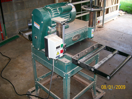 | Back to Top | This is our 15" thickness planer. It is on a mobile base and connects to the chip collector at the table saw. For large runs of lumber, we will add an intermediate chip collector which is easier to empty. It is fitted with a DRO for thickness control. |