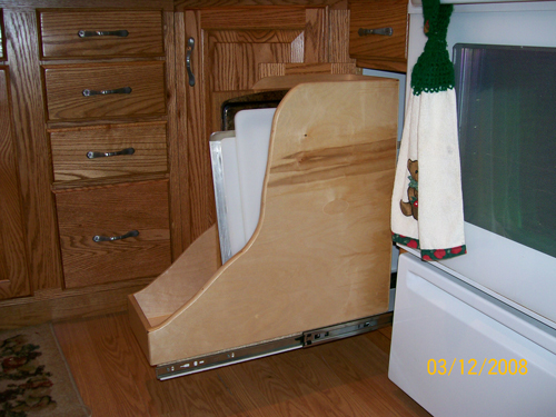 he narrow cabinet to the left of the range has a pull out shelf for vertical storage of baking sheets.