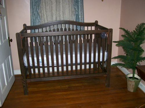 When you are ready to transition from the crib to the first bed, the front gate can be removed. When the child outgrows that arrangement, the rear panel is seperated from the assembly and becomes a headboard for a full size bed. Just bolt it to a metal frame or come back and see me for wooden rails and a footboard to match. Yes, other stains are available as well as your choice of wood species. |