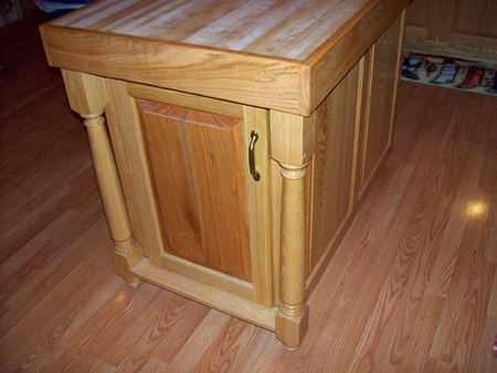 This end of the island has a solid, red oak, raised panel door. It opens fully whether the island is extended or closed & conceals two shelves for dry storage.