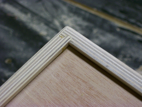 This joint is one type utilized on our drawer boxes. It provides plenty of glue surface in addition to the basic mechanical connection. Thus, a very reliable and attractive corner. Using this joint on all 4 corners and a bottom that is contained in a Dado on all 4 sides provides a drawer of incredible strength. The drawer box shown has a 1/8" thick bottom panel. You can also select the 1/2" thick bottom panel for additional strength. |