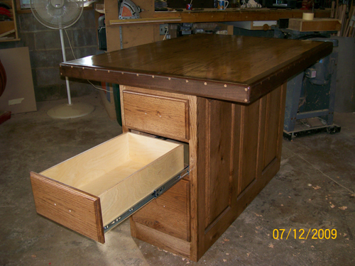 This table is designed to attach to the wall on the far end. Somthing similar to a peninsula cabinet. The near end is equipped with 3 drawers on full extension roller bearing glides. The drawers are constructed of 1/2" thick Baltic Birch throughout, including the bottoms. They have an applied drawer face of Red Oak. |