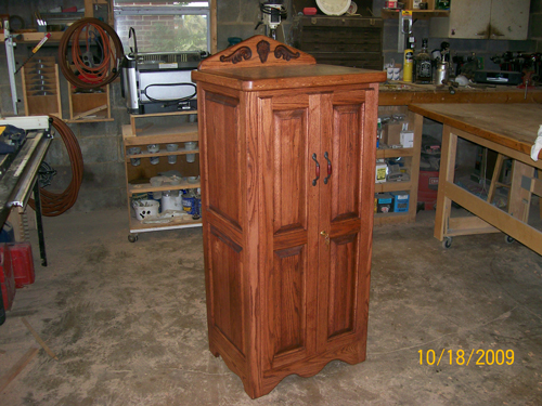 The inner frame is Soft Maple with a clear lacquer finish. The outer case and doors are "Wormy" Red Oak with a Minwax Red Oak stain and satin lacquer clear sealer. |