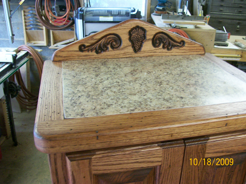 The top is a piece of formica banded by more of the "Wormy" Red Oak and dressed up with a crest rail engraved with a bunch of grapes. The edges of the formica were sanded to give the distressed appearance. |