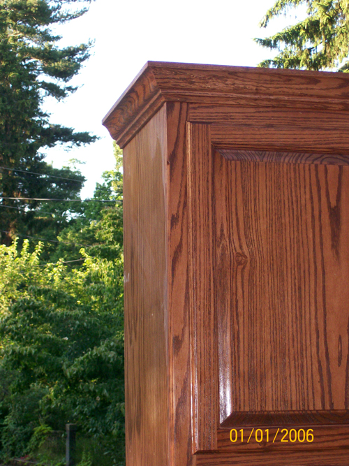 stand alone pantry cabinet topped with crown molding. The interior is a gloss white to really brighten it up and there is no center stile to block your access.