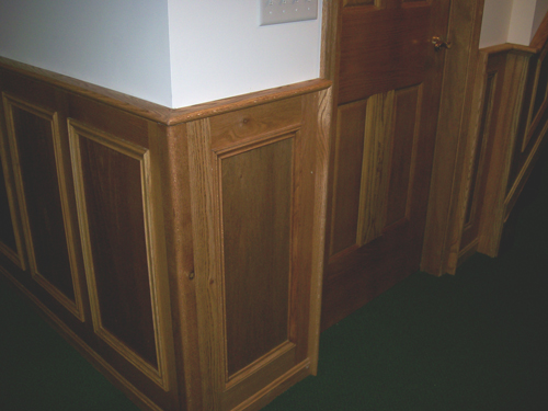 A closer look at the Wainscoting as it turns the corner shows some of the details in the construction. The cap is a 3/4" full radius bullnose that projects 2-1/4" from the drywall. Under that is a 3/4" cove molding. At the floor, a 4-1/2" base molding and a 3/4" shoe molding complete the main trim elements. The framework is traditional Rail & Stile joinery with the flat panel sitting in a rabbet. The panel is framed with a beaded molding. |
