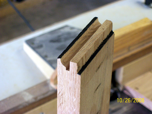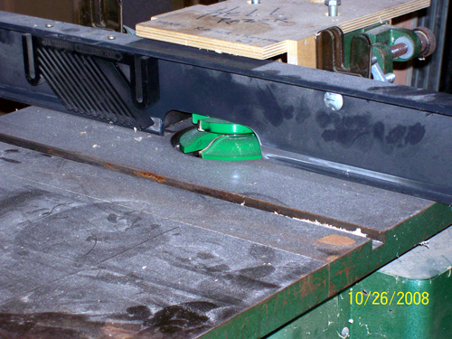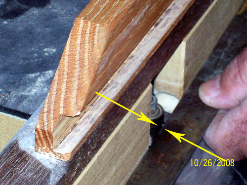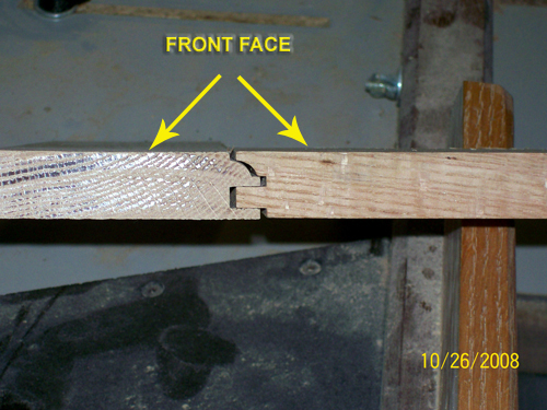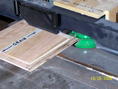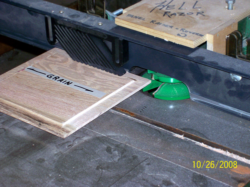STILES The first cut will be the cope cut on the ends of the rails. Set your tool height as instructed by the tool manufacturer and then set your router table fence so that it is in line with the bearing on the tool . ![]() Next, take a piece of scrap/extra material 6" to 8" square and make a practice cut. ![]() This sample cut now becomes your backer and your push tool... ![]() ...assuming that you are happy with the geometry of the cut. Ideally, (in my opinion) you want the 2 sections that I have blackened, to be about the same thickness. ![]() Stack your rails so that the more desirable grain pattern is facing down which will put it on the outside of the door. Use the block to square up the rails to the fence and push them through the cutter on each end. ![]() This part is now done. The second cut will be the rip. Set your tool height as instructed by the tool manufacturer and then temporarily, set your router table fence in line with the bearing on the tool. Take a practice cut on a piece of scrap/extra material and mate it up to the cut on the ends of the rails. You will need to adjust the height of your tool until the joint is flush on the face. ![]() Once you have dialed in the height, you may need to adjust your fence forward so that you are not taking the whole cut in one pass. ![]() Some woods, oak for instance, or highly figured woods (multi-directional grain patterns) are subject to tearing rather than cutting if you take too deep of a cut. I would suggest you set the fence somewhere around a quarter of an inch in front of the bearing on your tool for your first pass. Orient all your stock with the more desirable grain pattern facing down and the less desirable edge of that face towards the cutter. Run all the rails and stiles through this setup and then adjust the fence until it is in line with the bearing on the cutter for the finish pass. Once the machining is done, it would be advisable to sand the inner surfaces of the rails and stiles while they are easy to access. Lightly round over the edges of the dado. If there is any tear out or chipping present, you can round the edge over sufficiently to conceal this without detracting from the look of the door assembly. |